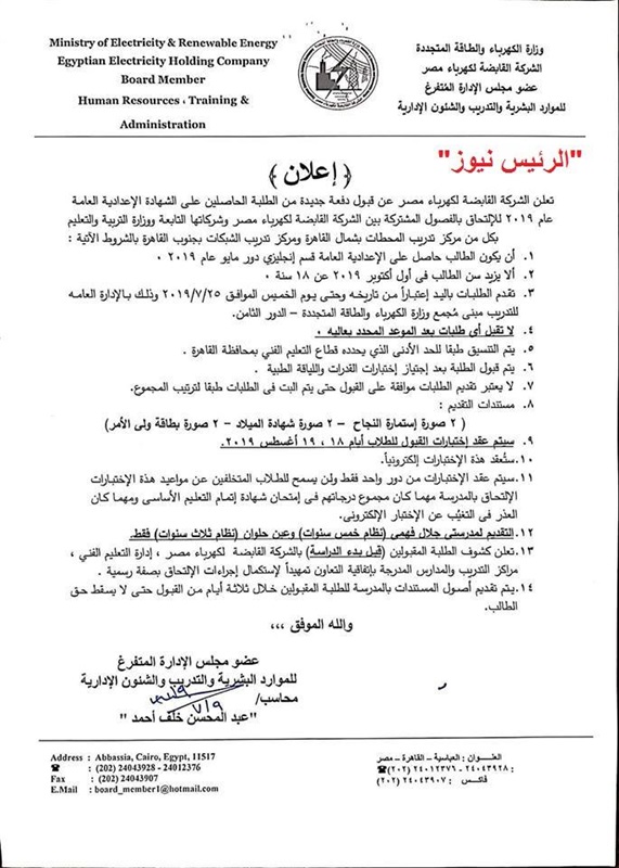 وأوضحت الشركة فى إعلان رسمى حصل موقع "الرئيس نيوز" على نسخة منه، أنه يتم تلقى طلبات القبول خلال الفترة من 9 يوليو الجارى حتى يوم الخميس الموافق 25 يوليو الجارى، وذلك في الإدارة العامة للتدريب بمبنى ديوان عام وزارة الكهرباء بالعباسية- الدور الثامن، مشددا على عدم تلقي أى طلبات بعد الموعد المحدد.