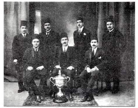 بينما يقف من اليمين إسماعيل يسري، يوسف محمد، محمد صبحي الأتربي، ونقولا عرقجي.