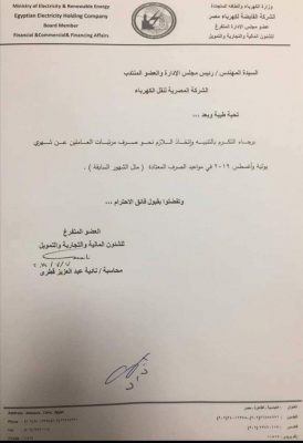 أكد مصدر مسئول في الشركة القابضة لكهرباء مصر أن مرتبات شهري يوليو واغسطس للعاملين بالشركة القابضة لكهرباء مصر والشركات التابعة لها، وكذلك الشركة المصرية لنقل الكهرباء ستصرف في مواعيدها المعتادة كل شهر دون تقديم أو تأخير.