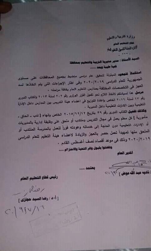 جاء ذلك في خطاب وجهه "حجازي" أمس للمديريات التعليمية، وذلك في إطار استعداداتها للعام الدراسي المقبل، وسد العجز في أعضاء هيئة التدريس، مطالبة بتفعيل الكتاب الدوري رقم 39 لسنة 2015 الخاص بإنهاء الندب والمعلمين الملحقين بالعمل بالمديريات والإدارات التعليمية.