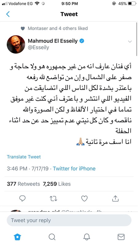 قدم المطرب محمود العسيلي اعتذارا على صفحته الرسمية في تويتر، اليوم، وذلك بعد موجة الهجوم عليه عبر السوشيال ميديا خلال الساعات الماضية بسبب توبيخه أحد معجبيه علنا.