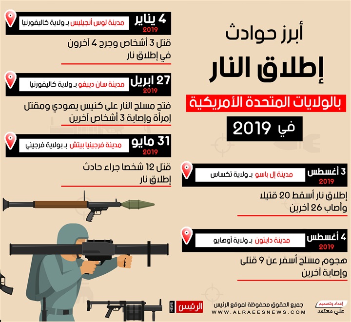 مالتى ميديا انفوجراف| أبرز حوادث «إطلاق النار» بالولايات المتحدة الأمريكية في 2019 الإثنين 05/أغسطس/2019 - 05:51 م 8/5/2019 5:51:00 PM طباعة facebook twitter whats شارك