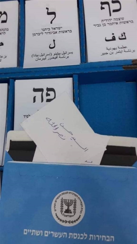 تداول مستخدمو وسائل التواصل الاجتماعي داخل إسرائيل، اليوم، صورة لورقة كتب عليها اسم الأمين العام لـ "حزب الله" اللبناني، حسن نصرالله، خلال الانتخابات البرلمانية التي تجري اليوم الثلاثاء.