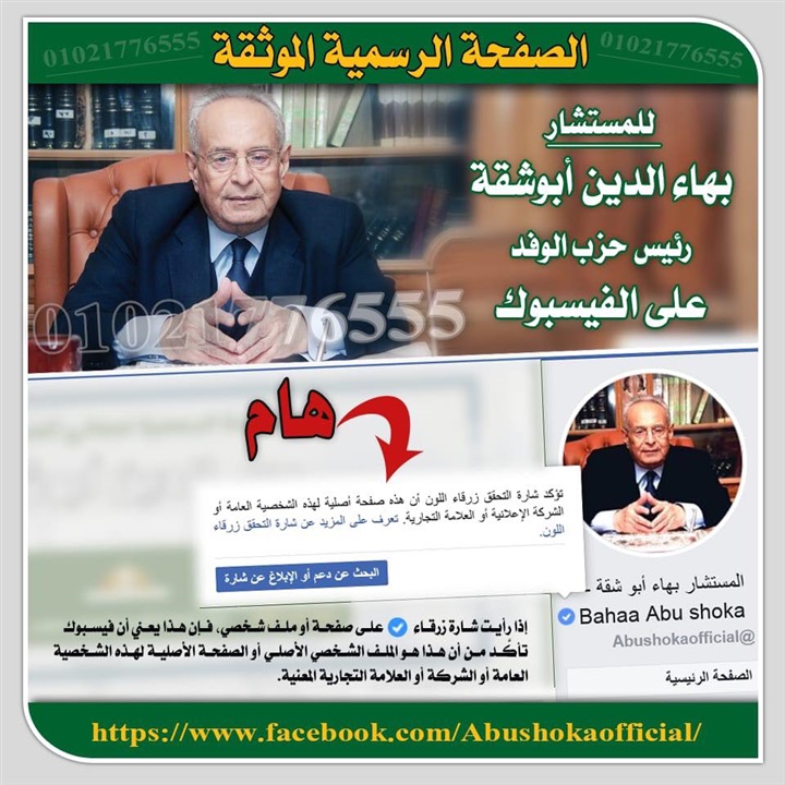 وثقت إدارة موقع "فيسبوك" اليوم، الصفحة الرسمية والوحيدة للنائب بهاء الدين أبوشقة، رئيس حزب الوفد، ورئيس اللجنة الدستورية والتشريعية في مجلس النواب.