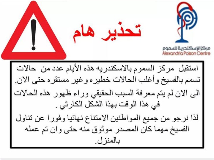 حذر "مركز السموم" التابع لكلية الطب جامعة الإسكندرية، في بيان عاجل اليوم السبت، من تزايد حالات تسمم الفسيخ خلال الأيام الأخيرة، مؤكدا أن أغلب المصابين في حالة خطرة وغير مستقرة.