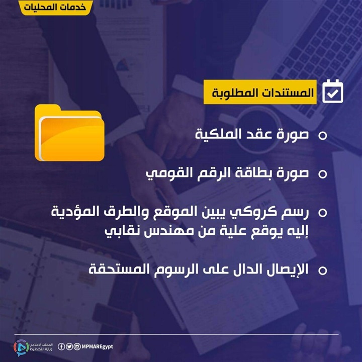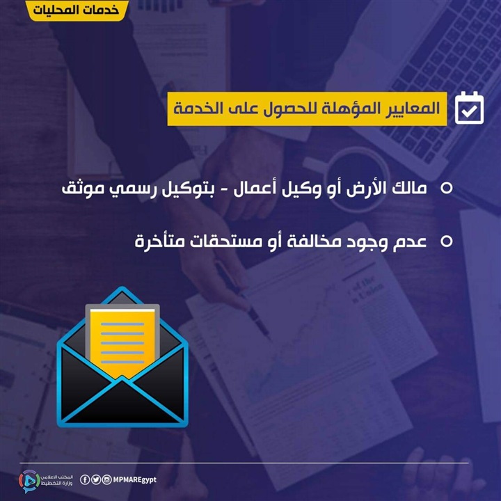 وأشار الأنفوجراف المنشور إلى أن المعايير المؤهلة للحصول على تلك الخدمة تتمثل فى عدم وجود مخالفات أو مستحقات متأخرة ووجود مالك الأرض أو وكيل أعمال بتوكيل رسمى موثق.