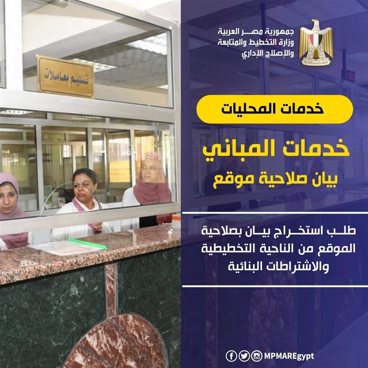 نشرت وزارة التخطيط والمتابعة والإصلاح الإدارى على صفحتها على موقع التواصل الاجتماعى "فيسبوك" انفوجرافًا يوضح كيفية طلب استخراج بيان بصلاحية موقع من الناحية التخطيطية والاشتراطات البنائية كخدمة من خدمات المبانى التى تقدم ضمن خدمات المحليات.