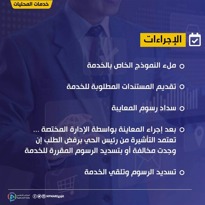 وأوضح انفوجراف وزارة التخطيط الإجراءات اللازم اتباعها للحصول على تلك الخدمة وهى ملء النموذج الخاص بالخدمة، تقديم المستندات المطلوبة للخدمة، سداد رسوم المعاينة، وبعد إجراء المعاينة بواسطة الإدارة المختصة تعتمد التأشيرة من رئيس الحى برفض الطلب إن وجدت مخالفة أو بتسديد الرسوم المقررة للخدمة، ثم فى النهاية على طالب الخدمة أن يقوم بتسديد الرسوم لتلقي الخدمة.