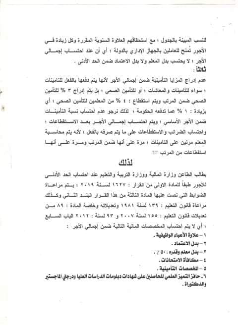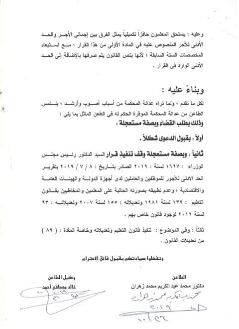 كما طالب الطاعن وزارتي "المالية والتربية والتعليم" عند احتساب الحد الأدني للأجور أن يتم مراعاة الضوابط التي نص عليها قانون التعليم وتعديلاته خاصة المادة 89 من تعديلات القانون 155 لسنة 2007 و93 لسنة 2013 الباب السابع، أي لا يتم احتساب المخصصات المالية التالية ضمن إجمالي: بدل الاعتماد، مكافأة الامتحانات، بدل معلم وقدره 50%، المخصصات التأمينية، حافز التميز العلمي للحاصلين علي شهادات دبلومات الدراسات العليا ودرجتي الماجستير والدكتوراة.