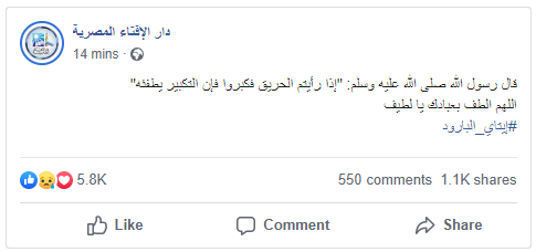 تفاعلت دار الإفتاء المصرية مع حريق خط أنابيب بترول إيتاي البارود، ودعت المواطنين من خلال صفحتها الرسمية بموقع التواصل الاجتماعي "فيس بوك"، للتكبير.