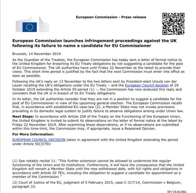 وقالت المفوضية في بيان "بصفتنا حارس للمعاهدات، أرسلت المفوضية الأوروبية اليوم خطابًا رسميًا إلى المملكة المتحدة لانتهاكها لالتزاماتها بموجب معاهدة الاتحاد الأوروبي بعدم اقتراح مرشح لمنصب مفوض الاتحاد الأوروبي".