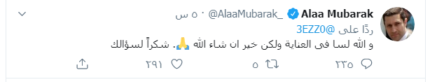 الصحية، وكتب علاء: "والله لسه في العناية، ولكن خير إن شاء الله. شكراً لسؤالك".