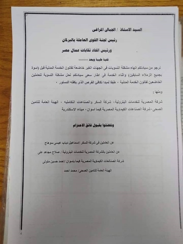 وطالب مقدمو الاستغاثة أعضاء مجلس النواب، بالتدخل لحل مشكلة التسويات في الجهات الخاضعة وغير الخاضعة لقانون الخدمة المدنية قبل وأثناء الخدمة أسوة بجميع زملائهم السابقين، طبقًا لمبدأ تكافؤ الفرص الذي يكفله الدستور، موضحين أن المادة 76 من القانون والخاصة بالتسوية للحاصلين على المؤهل الأعلى غير دستورية وترتب عليها ظلم عدد كبير من العاملين بالدولة.