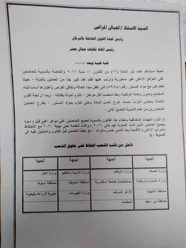 وتابعت: أن هذه المادة تتعارض مع مواد الدستور رقم 4-9-53 التي تكفل مبدأ العدالة وتكافؤ الفرص بإعتبارها أساسًا لبناء المجتمع وصون وحدته الوطنية وحقًا شخصيًا لكل مواطن، وبما أن لجنة القوى العاملة بمجلس النواب بصدد طرح تعديل للمادة، يقترح العاملون المتضررون من عدم التسوية التعديل الآتي: "تلتزم الجهات المخاطبة بأحكام هذا القانون بالتسوية لجميع الحاصلين علي مؤهل أعلي قبل وأثناء الخدمة حتي نهاية 2020 مع الإحتفاظ بالمرتب الأعلي والأقدمية بحد أقصي خمس سنوات، مع أحقية العاملين قبل القانون والمثبتين عليه في التسوية.