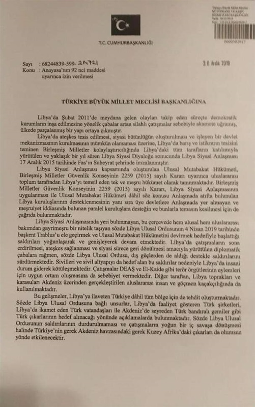 ويزعم الرئيس التركي أن رئيس ما تسمى حكومة "الوفاق" التي يقودها فائز السراج، طلب دعومًا بريًا وجويًا وبحريًا من تركيا، بناء على مذكرة تفاهم وقعها الطرفان وتقتضي تقديم الدعم التركي للميليشيات المتمركزة في العاصمة طرابلس، وقد أثارت تلك المذكرة ردود فعل دولية غاضبة.