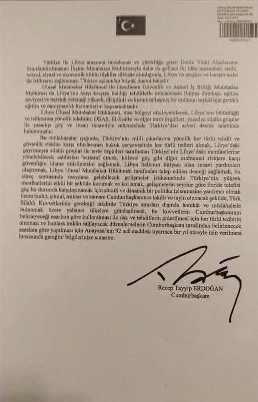 وقع الرئيس التركي رجب طيب أردوغان، مساء اليوم الاثنين، على مذكرة إرسال قوات تركية إلى ليبيا، علما أنه قد تم تسليم المذكرة للبرلمان، والتي من المقرر بحسب ما هو معلن أن يتم مناقشتها الخميس المقبل وإقرارها، لكون الأغلبية البرلمانية لتكتل حزبي "العدالة والتنمية" الذي يترأسه أردوغان، وحزب "الحركة القومية" الذي يتزعمه القومي دولت باهتشلي.