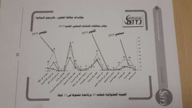 ثم ألفاظ سوقية ومتدنية بواقع 47 مخالفة فى نوفمبر، 27 فى أكتوبر، 31 فى سبتمبر بإجمالى 105 مخالفات بنسبة 17.1%، وعدم احترام اللغة العربية حيث بلغت 54 مخالفة فى نوفمبر، و23 في سبتمبر، و5 فى أكتوبر بإجمالى 82 مخالفة بنسبة 13.4%.