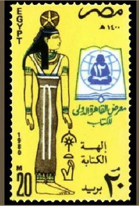 مميزة لتمثال امرأة فرعونية، ومكتوب عليه "إلهة الكتابة" في إشارة إلى