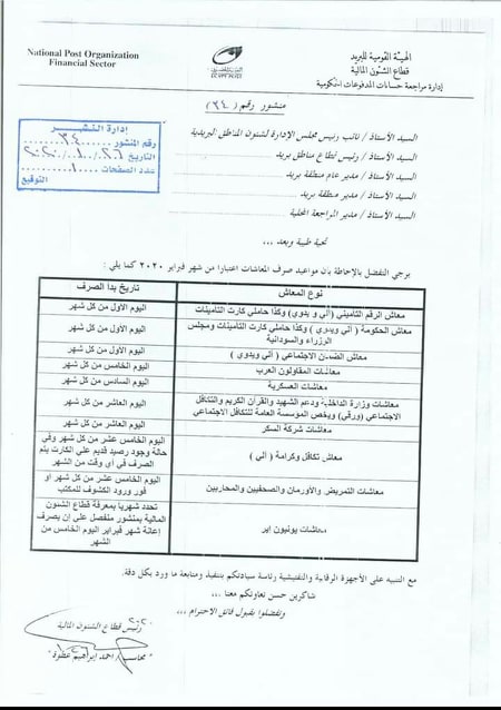 تعليماتها بشأن مواعيد صرف المعاشات اعتباراً من شهر فبراير 2020، وفقًا لمنشور