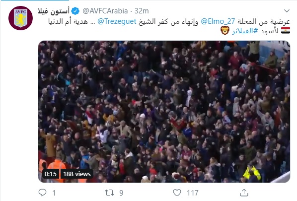 وكتب الحساب الرسمي لأستون فيلا، عبر موقع التواصل الاجتماعى "تويتر": "عرضية من المحلة وإنهاء من كفر الشيخ.. هدية أم الدنيا لأسود الفيلانز".