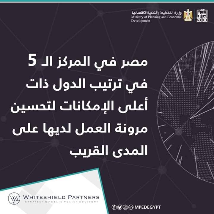 أكدت وزارة التخطيط والتنمية الاقتصادية، أن مصر جاءت في المركز الخامس في ترتيب الدول ذات أعلى الإمكانات لتحسين مرونة العمل لديها على المدى القريب، وذلك من خلال تنفيذ أفضل السياسات، بحسب المؤشر العالمي لقياس مرونة سوق العمل، والذي يصدر سنويًا في مؤتمر دافوس ويصنف البلدان على أساس درجة مرونة أسواق العمل.