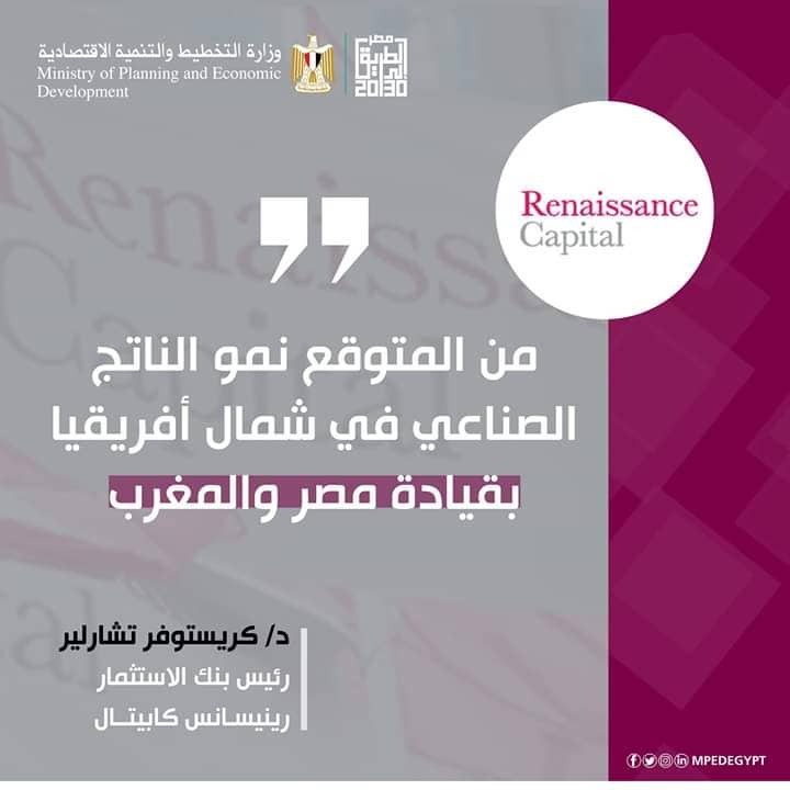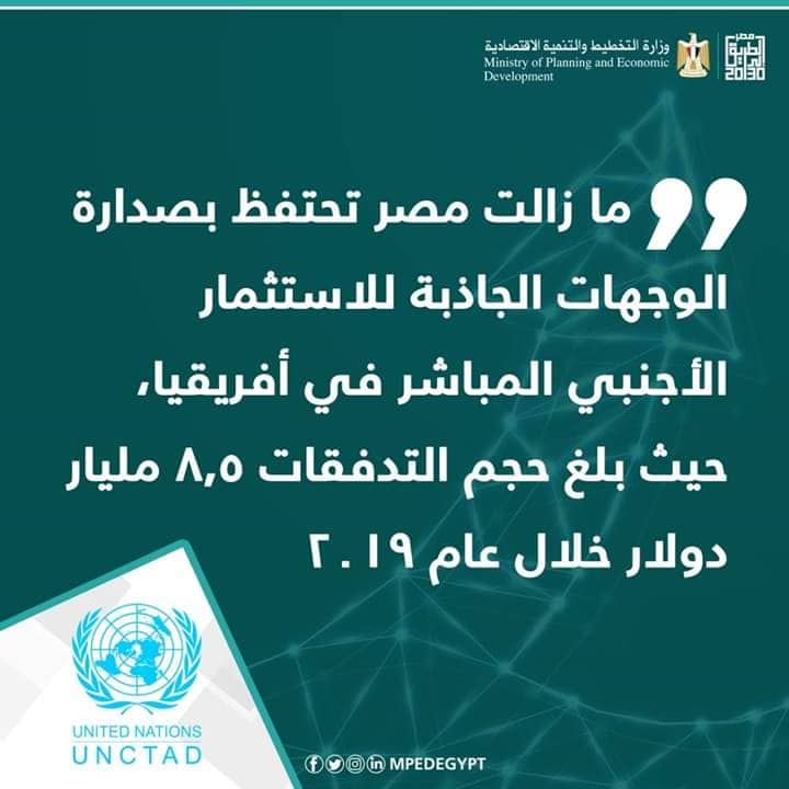 ولفتت الوزارة، إلى توقعات بنك الاستثمار رينيسانس كابيتال نمو الناتج الصناعى فى شمال إفريقيا بقيادة مصر والمغرب، فيما أشادت أحدث تقارير منظمة الأمم المتحدة للتجارة والتنمية "الأنكتاد"، باحتفاظ مصر بمركزها كأكبر متلق للاستثمار الأجنبى المباشر فى إفريقيا، إذ بلغ حجم التدفقات 8.5 مليار دولار خلال عام 2019.