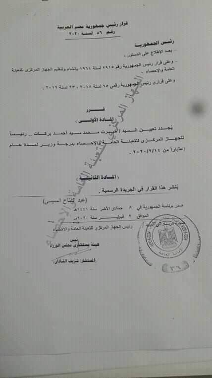 أصدر الرئيس عبد الفتاح السيسي، اليوم الأحد، القرار رقم 56 لسنة 2020 بتجديد تعيين خيرت محمد السيد أحمد بركات رئيسا للجهاز المركزى للتعبئة العامة والإحصاء، بدرجة وزير لمدة عام، اعتبارا من يوم 14 فبراير 2020.