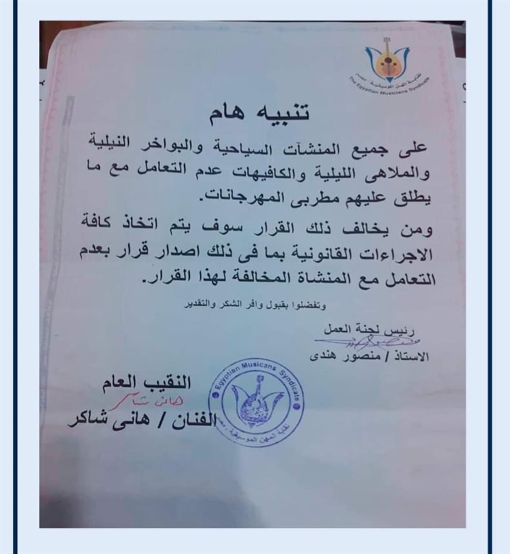 وقال هاني شاكر في القرار الذي حصلت "الرئيس نيوز " على نسخة منه: "على جميع المنشأت السياحية والبواخر النيلية والملاهى الليلية والكافيهات عدم التعامل مع من يطلق عليهم مطربى المهرجانات، ومن يخالف ذلك القرار ستقوم النقابة باتخاذ الإجراءات القانونية ضده وضد المنشأة التى سمحت لهم بالغناء".