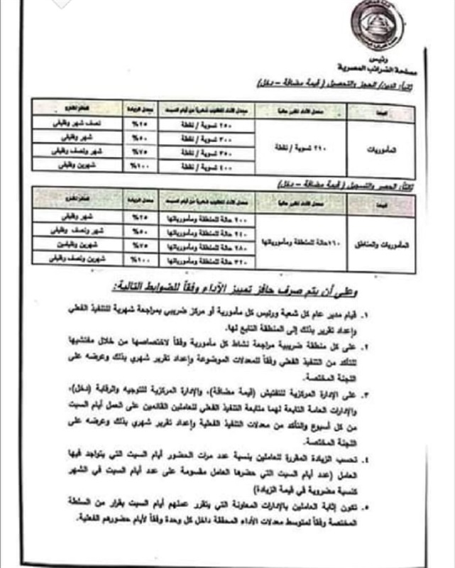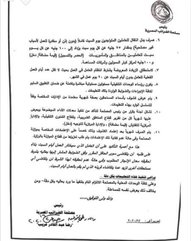 وألزم القرار رؤساء المأموريات بمتابعة نسب الإنجاز وحوافز الإثابة وعدد مرات حضور يوم السبت مع زيادة بدل الانتقال لما يتراوح بين 75 و100 جنيه عن كل يوم السبت، و1700 جنيه للعاملين بمركز كبار الممولين.