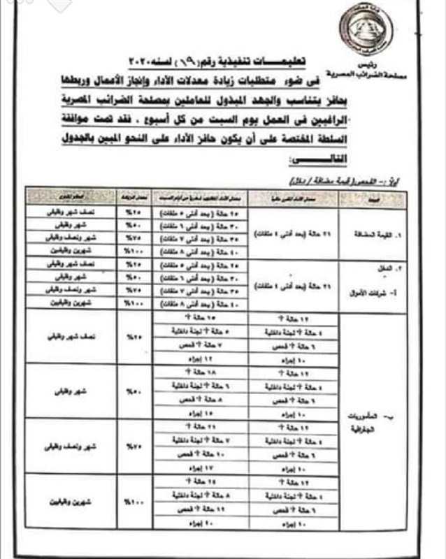 أقرت مصلحة الضرائب حوافز أداء جديدة لموظفيها مع قرار السماح للموظفين بالعمل يوم السبت لزيادة قيمة الحافز.