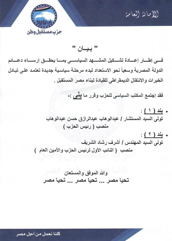 أعلن حزب مستقبل وطن فى بيان رسمى له، عن التغييرات الجديدة فى قياداته ، وجاء فى البيان تولى المستشار عبد الوهاب عبد الرازق، منصب رئيس الحزب، خلفا لأشرف رشاد الذى تولى منصب النائب الاول لرئيس الحزب