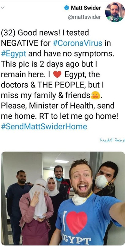 وكتب الصحفي مات سويدر في تغريدة له على "تويتر" أن نتيجة تحليل العينة الخاصة به ظهرت سلبية في فيروس كورونا، وأشار إلى أنه يحب مصر والأطباء المصريين ولكنه يشعر بالاشتياق لأسرته.