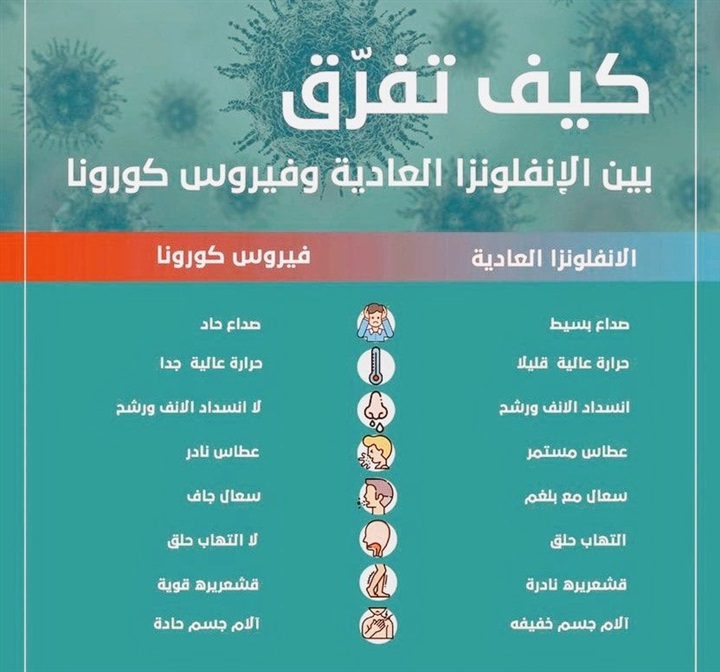 ينشر"الرئيس نيوز" إنفوجرافًا توضيحيًا حول الفرق بين الإنفلونزا العادية وفيروس الكورونا المستجدة. ووتتمثل أعراض الإنفلونزا في "صداع بسيط، حرارة عالية قليلاً، انسداد الانف ورشح، عطس مستمر، سعال مع بلغم، التهاب بالحلق، قشعريرة نادرة، ألاف خفيفية بالجسم".
