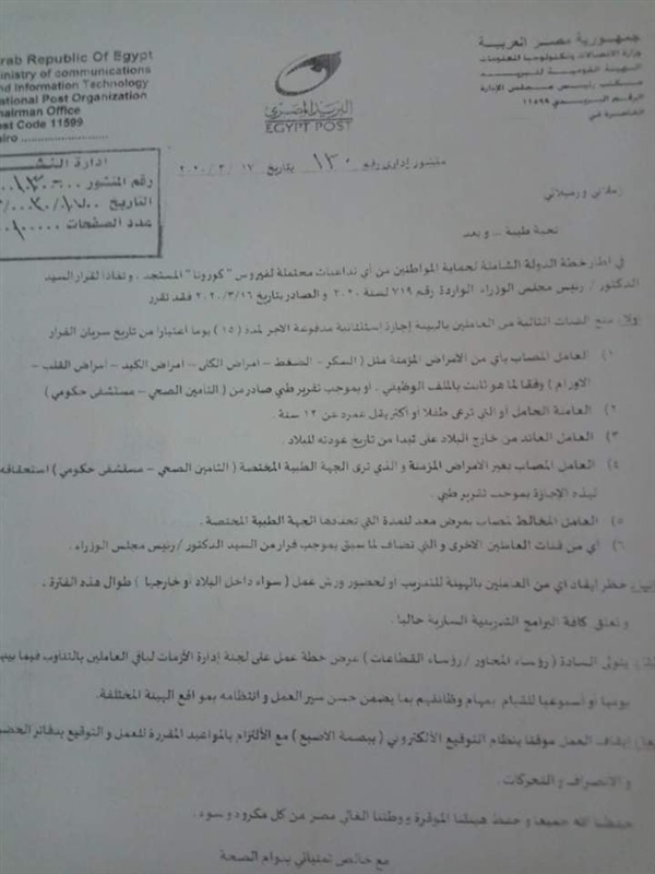 أصدرت الهيئة القومية للبريد، تعليماتها بمنح 6 فئات من موظفيها على مستوى الجمهورية، إجازة استثنائية مدفوعة الأجر لمدة 15 يوم اعتبارًا من اليوم الثلاثاء، وذلك فى إطار خطة الدولة الشاملة لحماية المواطنين من أى تداعيات محتملة لفيروس كورونا المستجد وفقًا لقرار رئيس مجلس الوزراء الصادر مؤخرًا بخفض أعداد موظفى الجهاز الإدارى للدولة والمصالح الحكومية.
