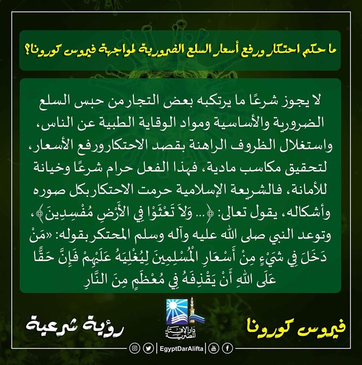 7. ما حكم احتكار ورفع أسعار السلع الضرورية لمواجهة فيروس كورونا؟