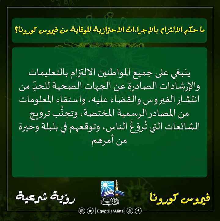 6. ما حكم الالتزام بالإجراءات الاحترازية للوقاية من فيروس كورونا؟