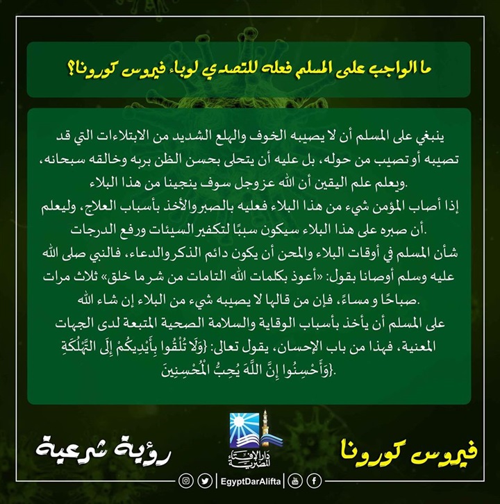 أجابت دار الإفتاء المصرية اليوم الثلاثاء، عبر صفحتها الرسمية على موقع التواصل الاجتماعى "فيس بوك" على عدد من أسئلة المتابعين والمواطنين المتعلقة بانتشار فيروس كورونا.