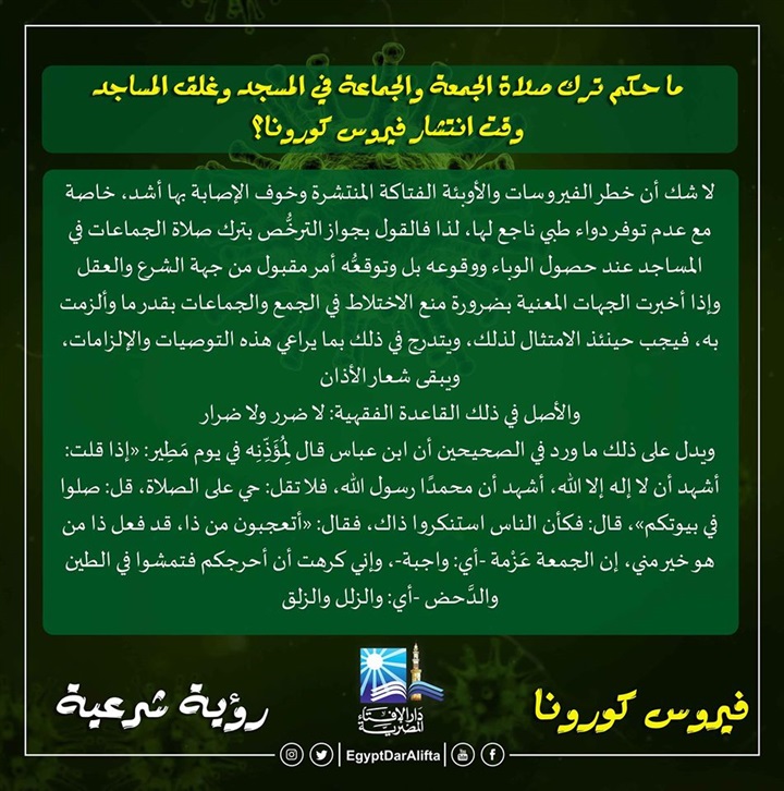 9. ما حكم ترك صلاة الجمعة والجماعة في المسجد وغلق المساجد وقت انتشار فيروس كورونا؟.