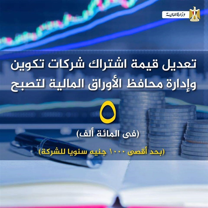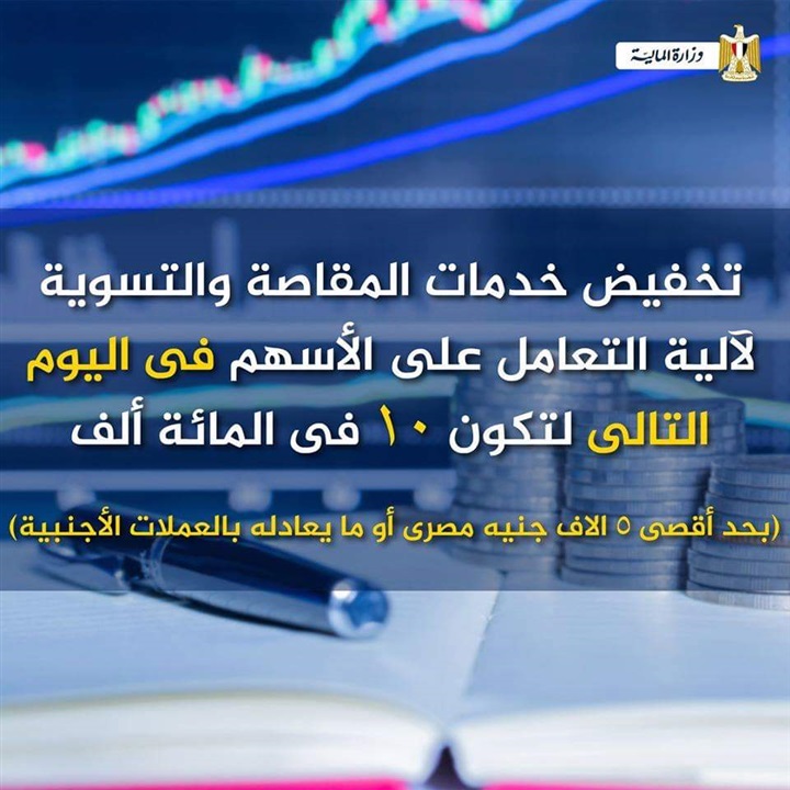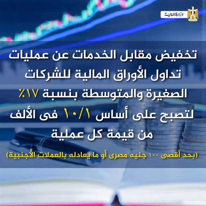 حيث إن المجموعة الوزارية الاقتصادية وافقت على تخفيض مقابل الخدمات عن عمليات التداول بالبورصة بنسبة ۲٠ ٪ لتصبح ٥٪ بدلاً من ٦,٢٥ في المائة ألف الذي تتقاضاه الهيئة العامة للرقابة المالية، وتعديل قرار وزير الاستثمار رقم ۲۳۱ لسنة ۲۰۰۸ بشأن تحديد عمولات السمسرة ورسوم قيد الأوراق المالية ومقابل الخدمات عن عمليات البورصة، بحيث يتم تخفيض مقابل الخدمات المنصوص عليها بالقرار بنسبة ١٧٪، وتضمن مشروع القرار الجديد مقابل الخدمات الذي تتقاضاه البورصة عن عمليات تداول الأوراق المالية للشركات الصغيرة والمتوسطة على أساس ١/ ١٠ في الألف من قيمة كل عملية تتم على الأوراق المالية المقيدة بالبورصة بحد أقصى ۱۰۰ جنيه مصري أو ما يعادله بالعملات الأجنبية.