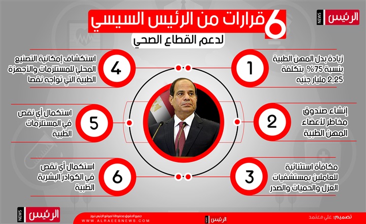 مالتى ميديا انفوجراف.. 6 قرارات من الرئيس السيسي لدعم القطاع الصحي الأحد 29/مارس/2020 - 08:57 م 3/29/2020 8:57:00 PM طباعة facebook twitter whats شارك