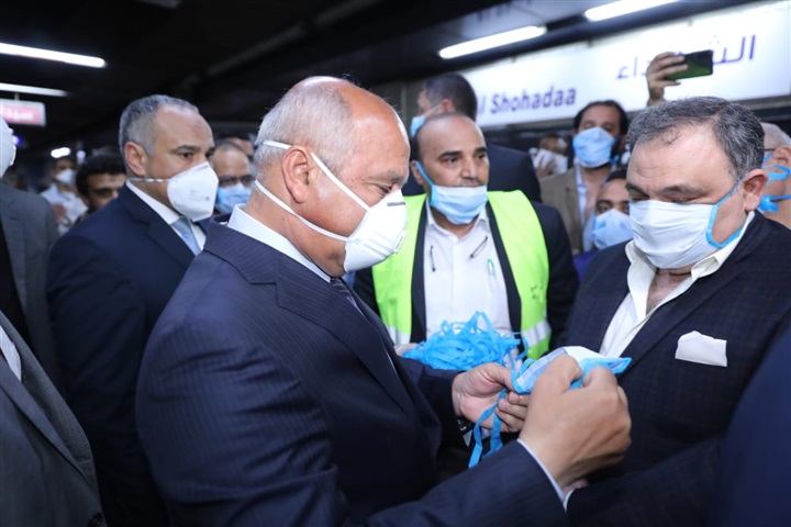 شهد وزير النقل كامل الوزير، اليوم، إطلاق مبادرة عدد من رجال الأعمال المصريين لتوزيع 400 ألف كمامة طبية مجانا على ركاب مترو الأنفاق بمحطة الشهداء.