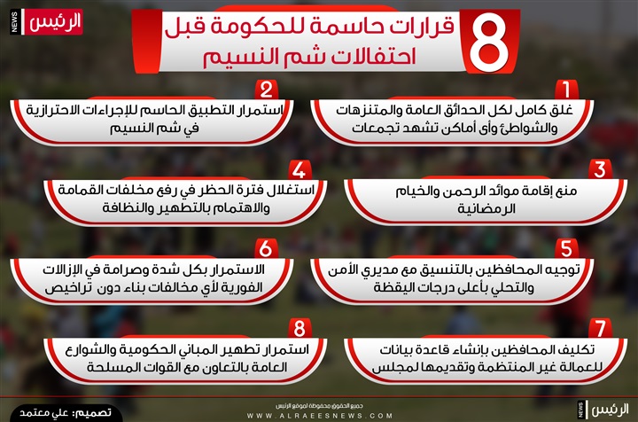 مالتى ميديا انفوجراف.. 8 قرارات حاسمة للحكومة قبل احتفالات شم النسيم الأربعاء 15/أبريل/2020 - 04:55 م 4/15/2020 4:55:00 PM طباعة facebook twitter whats شارك