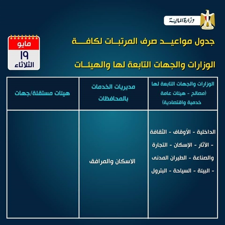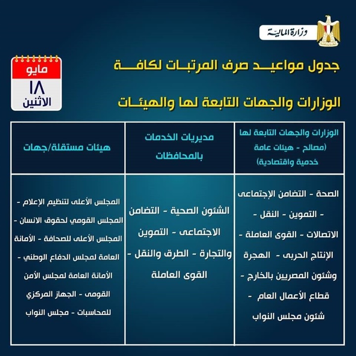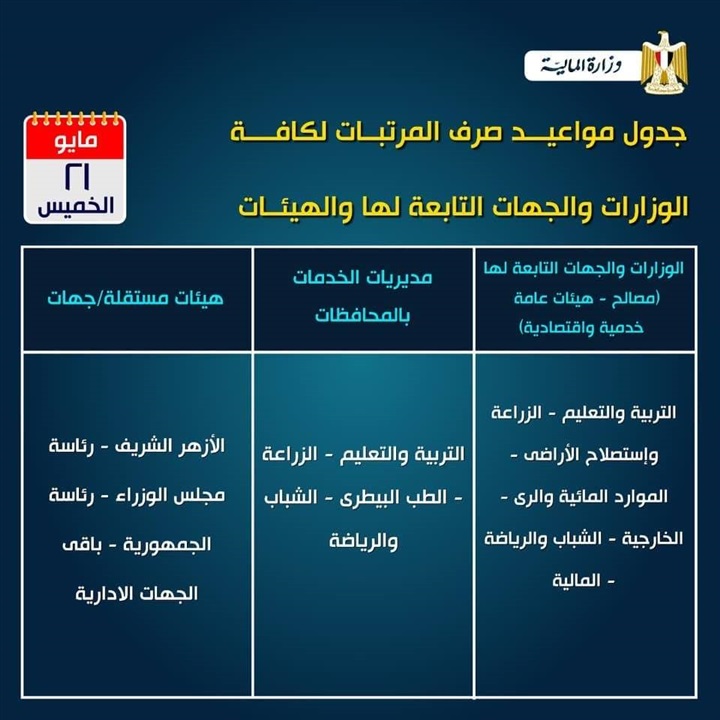 وقالت في بيان إنه تم وضع مواعيد صرف محددة لمرتب شهر مايو لكل وزارة أو هيئة والجهات التابعة لها، بمراعاة عدد العاملين بها والمديريات التابعة لها بالمحافظات، مع تبكير مواعيد الصرف لكل الجهات وفى مقدمتها مستحقات العاملين التابعين لوزارتي الصحة والداخلية؛ تقديرًا لجهودهم في مواجهة فيروس كورونا المستجد، حيث تقرر بدء صرف مرتبات العاملين في 17 وزارة وهيئة يوم 18 مايو، ثم بدء صرف مرتبات ١٠ وزارات يوم 19 مايو، ثم بدء صرف مرتبات 11 وزارة وهيئة يوم 20 مايو، ثم بدء صرف مرتبات ٩ وزارات وهيئات يوم 21 مايو.اقرأ أيضا.. "لازم اعرف كل جنيه بيتصرف فين".. وزير المالية يتعهد للنواب بترشيد الإنفاق الحكومى