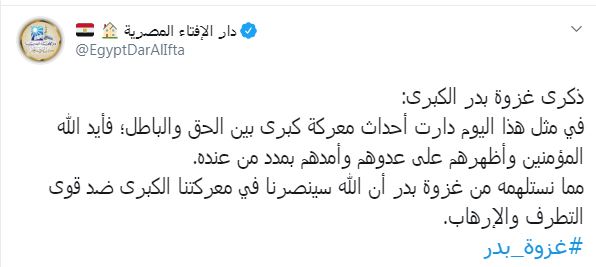 وقالت دار الإفتاء في منشور على حسابها الرسمي بـ"تويتر": "ذكرى غزوة بدر الكبرى.. في مثل هذا اليوم دارت أحداث معركة كبرى بين الحق والباطل؛ فأيد الله المؤمنين وأظهرهم على عدوهم وأمدهم بمدد من عنده.. مما نستلهمه من غزوة بدر أن الله سينصرنا في معركتنا الكبرى ضد قوى التطرف والإرهاب".
