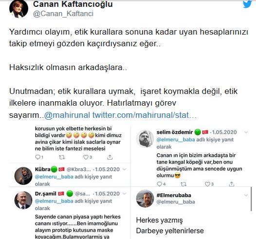 وطالبت كافتانجي أوغلو نائب رئيس حزب العدالة والتنمية ماهر أونال بتنفيذ ما دعا إليه سابقًا من تعقب ناشري التهديدات على تويتر، مشيرةً إلى حديثه السابق لأعضاء حزب العدالة والتنمية عن اتباع القواعد الأخلاقية على الإنترنت.