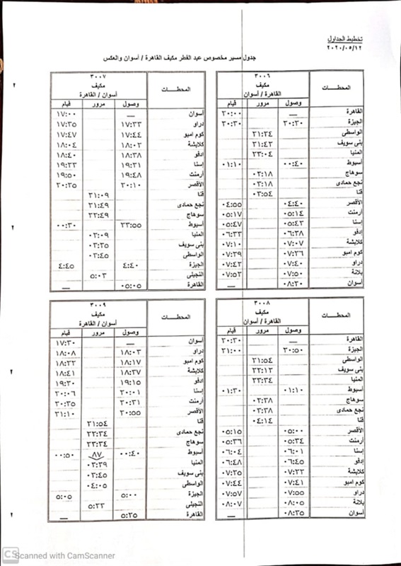 قررت هيئة السكك الحديدية الحديد، تشغيل ٦ قطارات إضافية على خط القاهرة أسوان وبالعكس بواقع ٤ قطارات مكيفة وقطارين مميزين خلال الفترة من ١٨ مايو إلي ٤ يونيو ٢٠٢٠ ليصبح إجمالي عدد القطارات الشغالة على خطوط الهيئة على الوجهين القبلي والبحري ٧٢٢ قطارا.