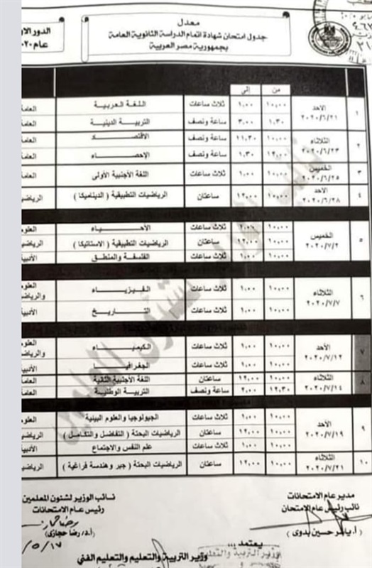 وحمل الجدول المنشور توقيع الدكتور رضا حجازي نائب وزير التربية والتعليم لشئون المعلمين, والدكتور ياسر حسين بدوى مدير عام الامتحانات.
