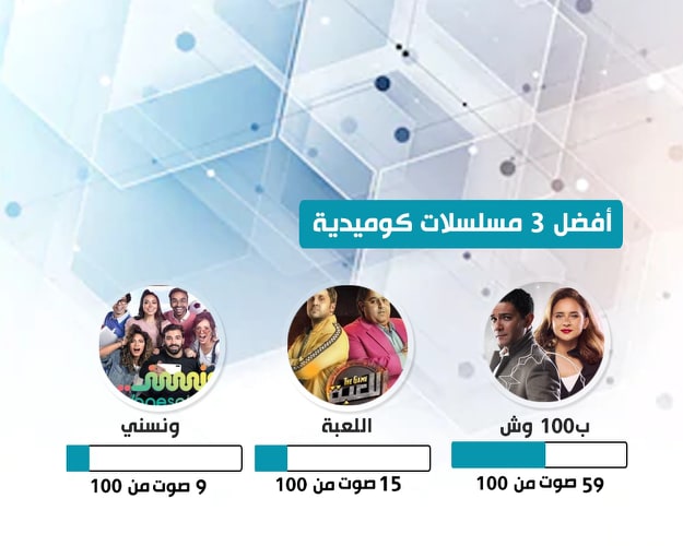في استبيان "الرئيس نيوز" عن أفضل مسلسل كوميدي خلال السباق الدرامي الذي ينتهي اليوم، جاء تصويت 100 شخص من بين نقاد وكتاب ومخرجين ومتخصصين لصالح مسلسل "بـ100 وش"، بطولة نيللي كريم وأسر ياسين، وفي المركز الثاني جاء مسلسل "اللعبة"، ويليه مسلسل "ونسني".
