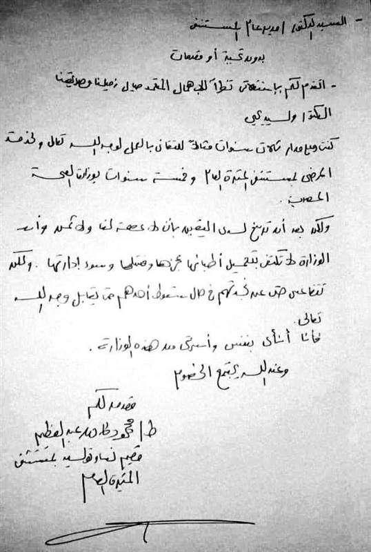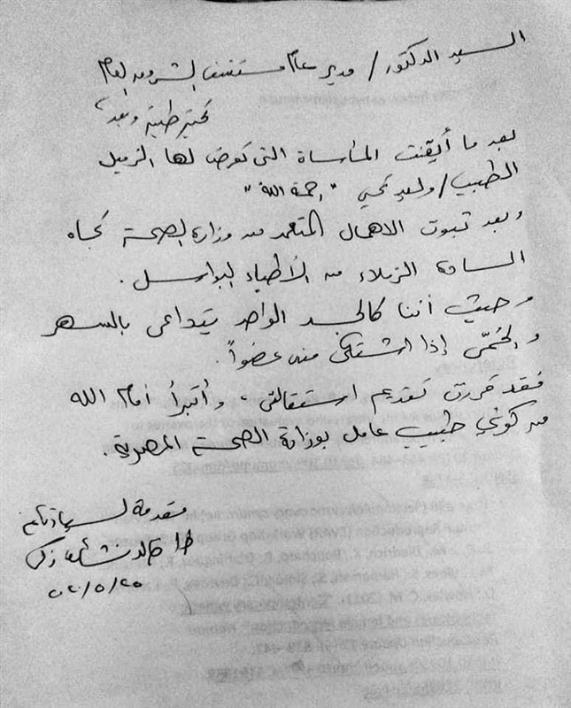 وتداول رواد مواقع التواصل الاجتماعى استقالات لاثنين من الأطباء احتجاجا على عدم توفير سبل الوقاية الطبية وإجراء المساحات كذا عدم تخصيص مستشفيات عزل للطواقم الطبية.