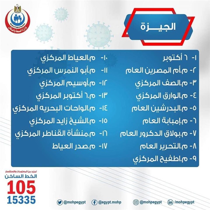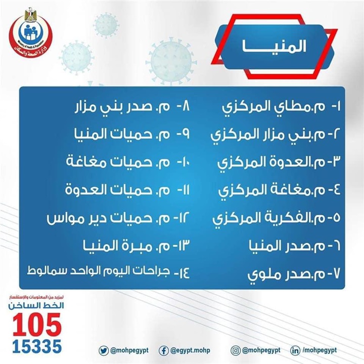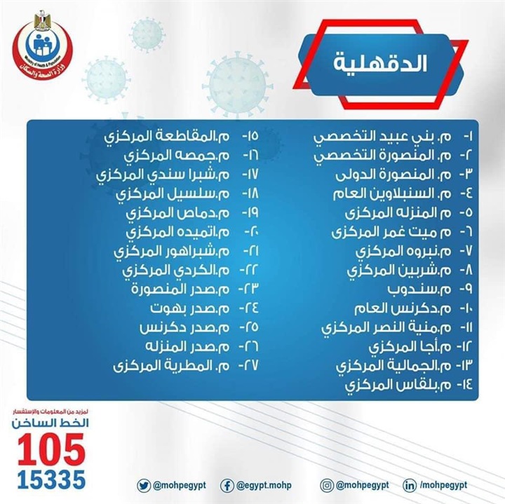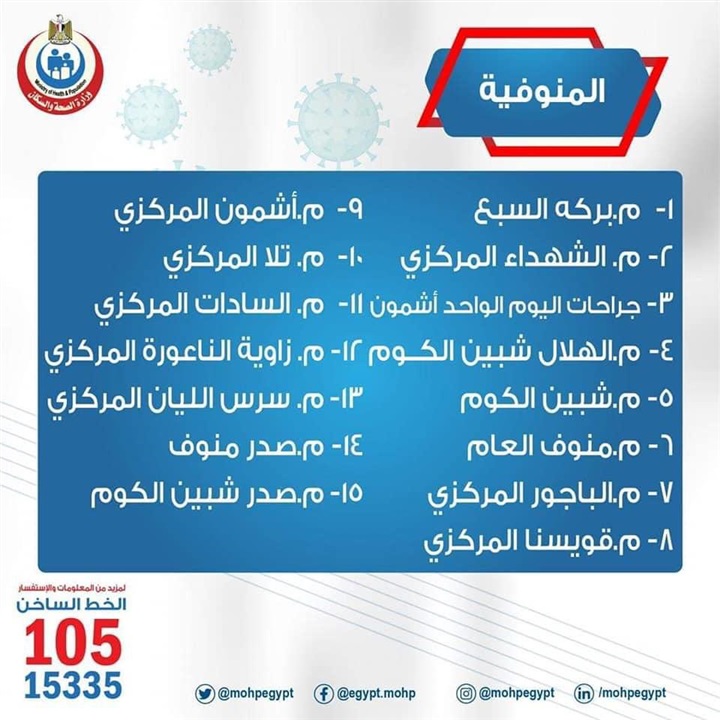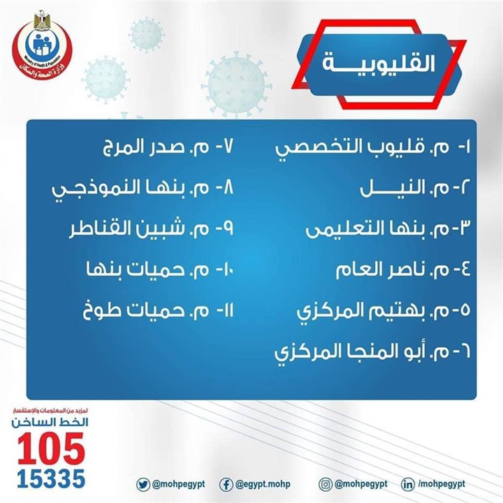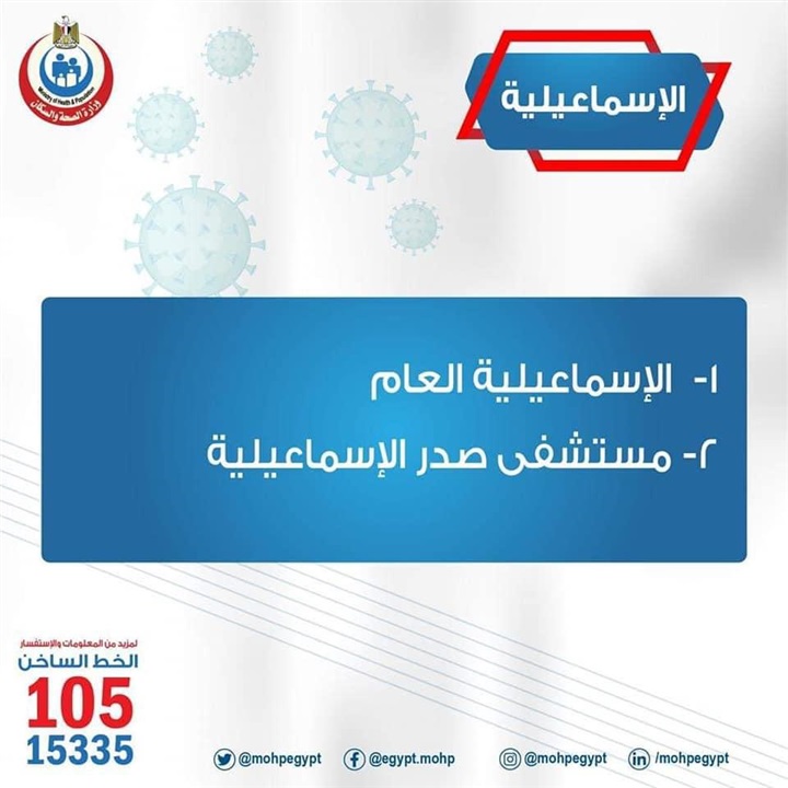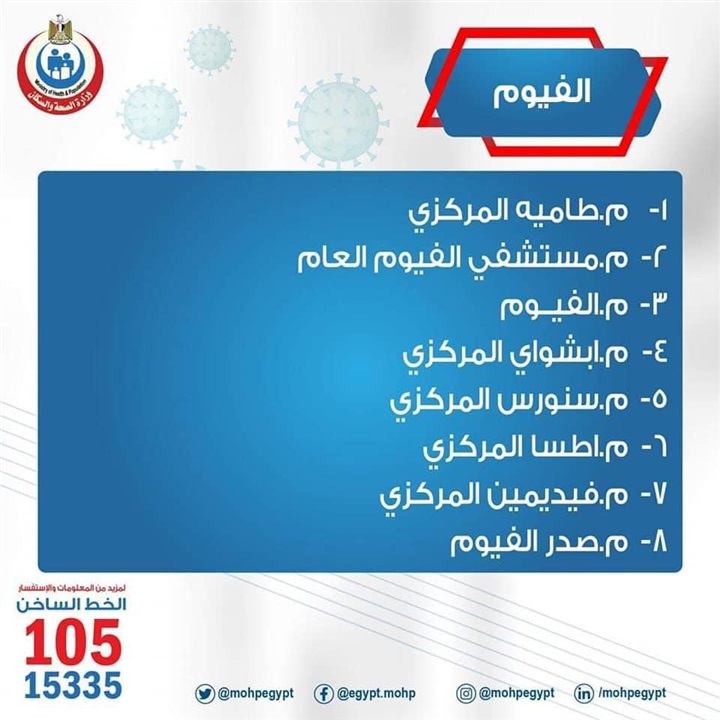 ونشرت الصفحة الرسمية للوزارة عبر "فيس بوك" إنفوجراف بأسماء المستشفيات المخصصة فى كل محافظة.